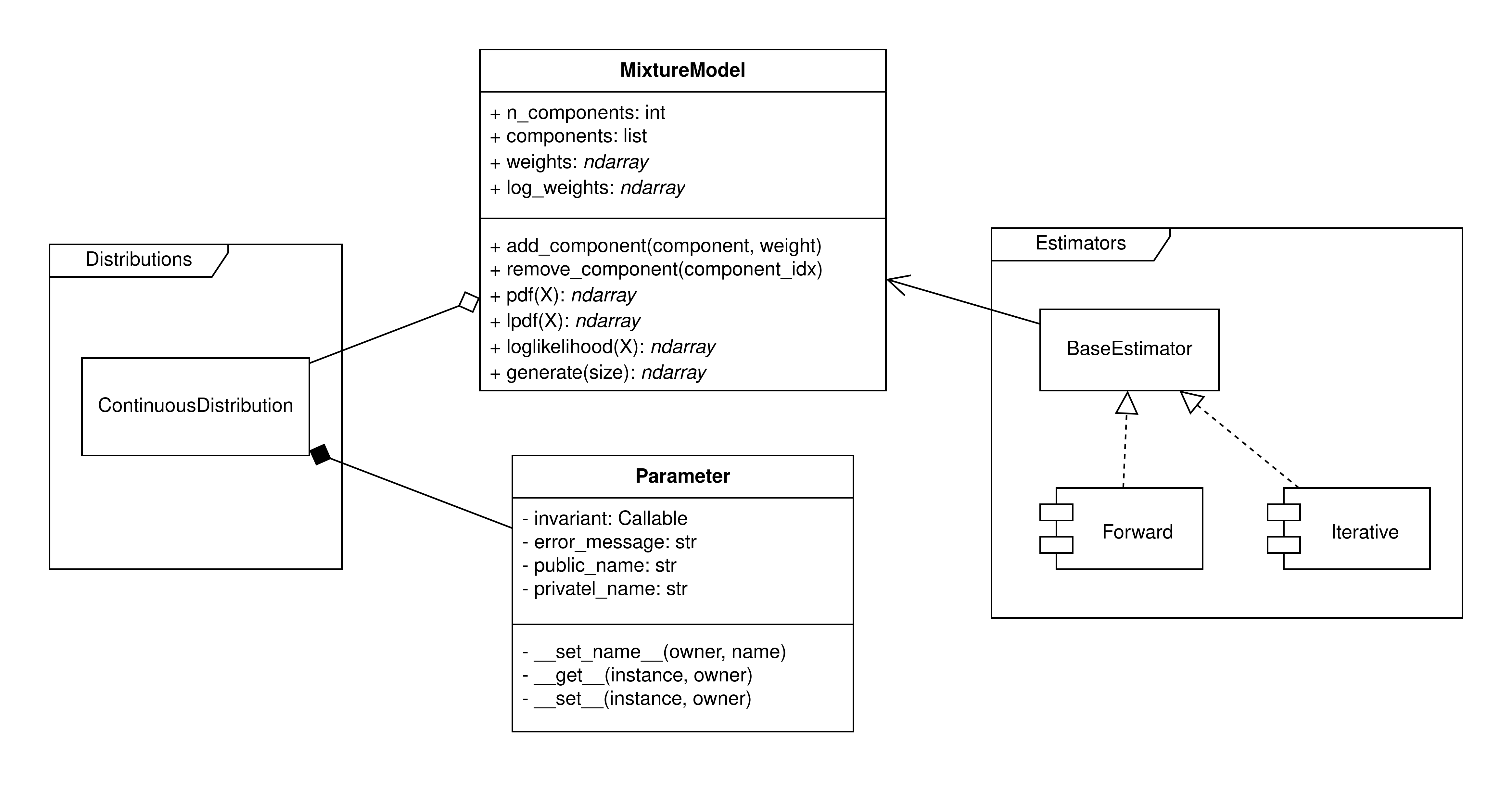 Предоставляет класс смеси распределений, а так же дескриптор, позволяющий реализовывать свои распределения. (Решил его вынести сюда а не в Distributions)