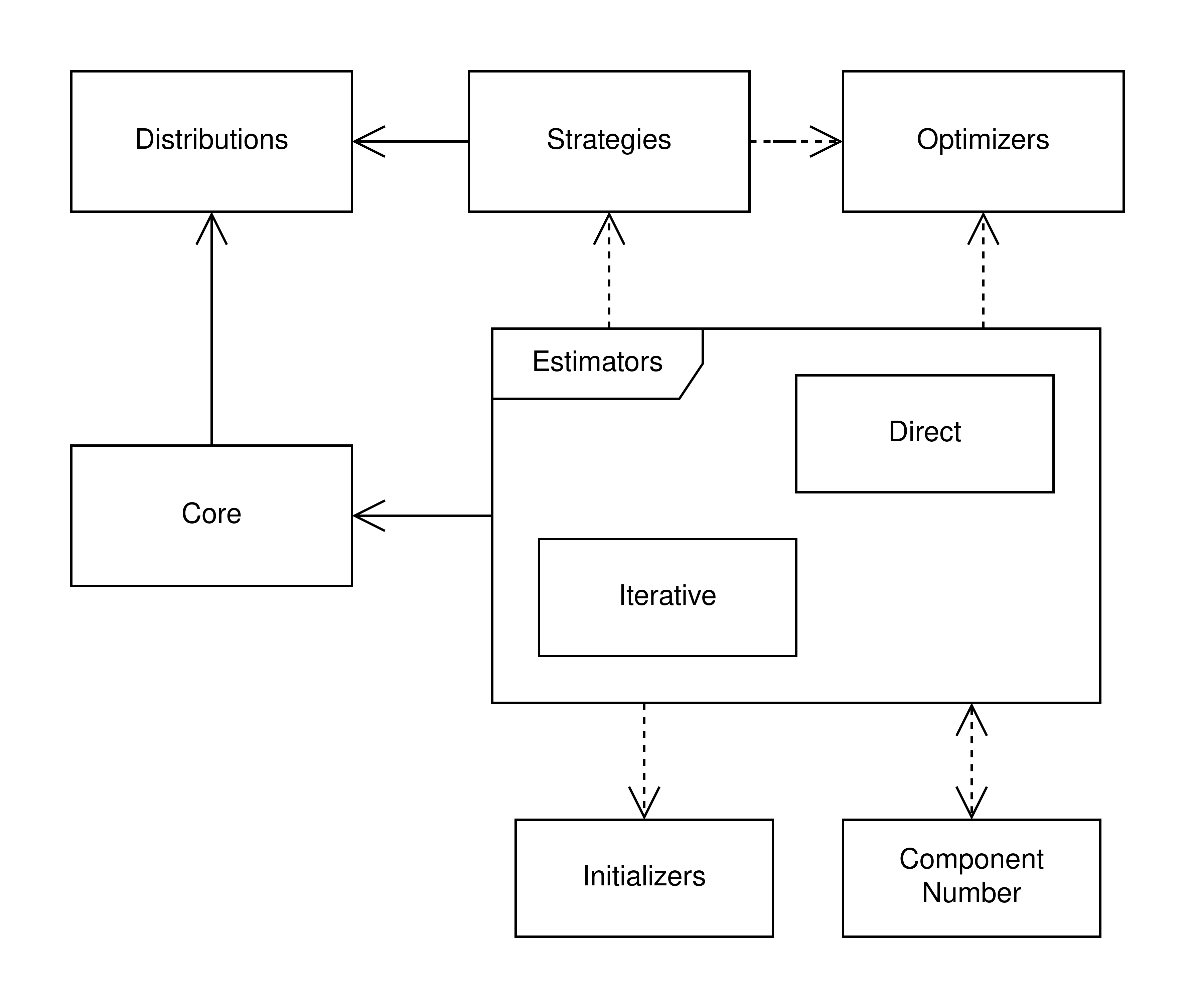 @singledispatch, для каждой компоненты можно задать свою, наиболее эффективную аналитическую или численную стратегию оценки (например, через Q-функцию или метод моментов), что делает систему легко расширяемой.Оптимизаторы (Optimizers): Предоставляют общие численные методы оптимизации. Они используются стратегиями в тех случаях, когда для оценки параметров компоненты нет аналитического решения. Также могут использоваться напрямую некоторыми оценщиками (например, в MLE для прямой максимизации правдоподобия всей смеси).